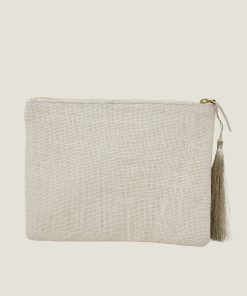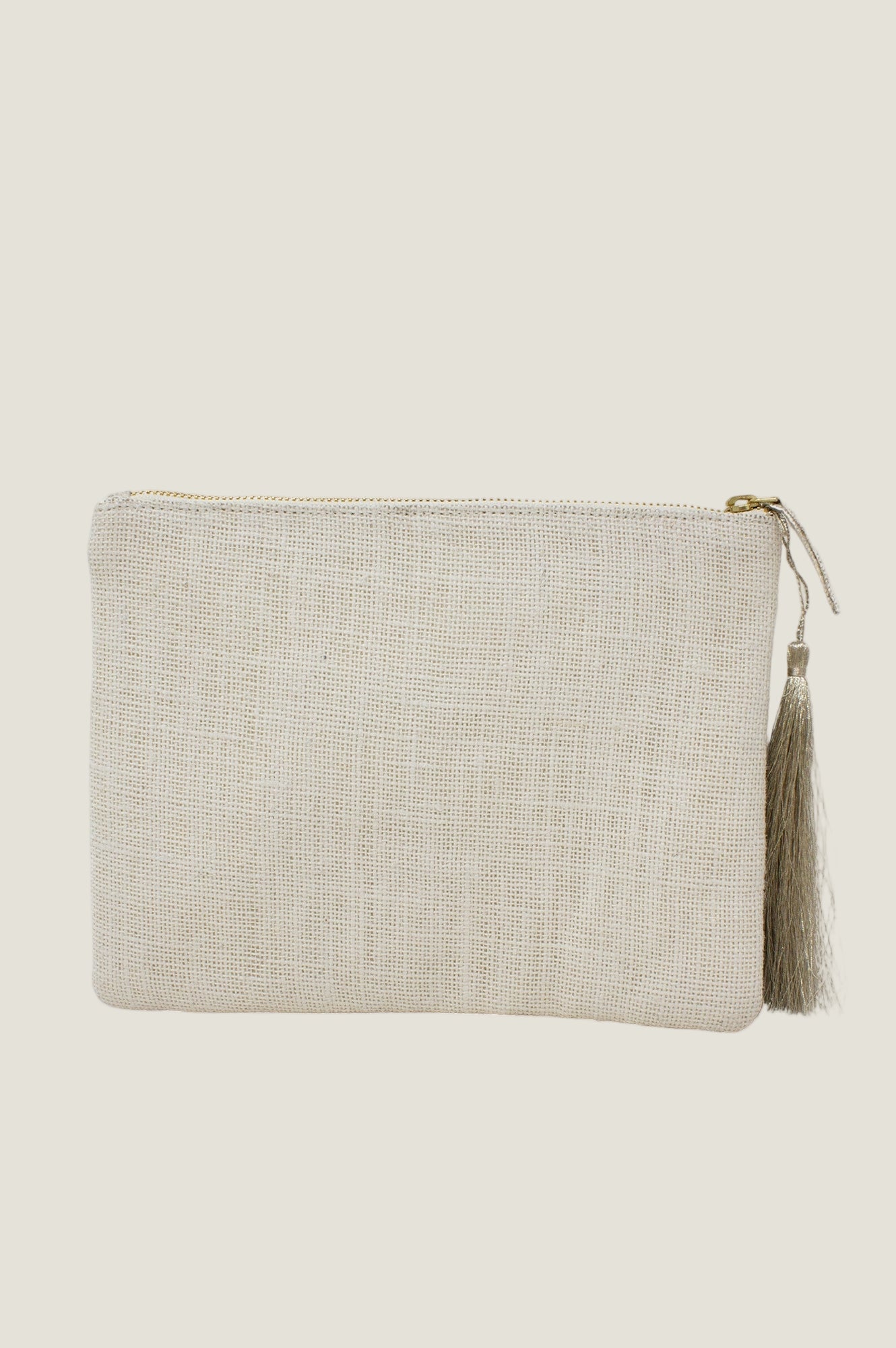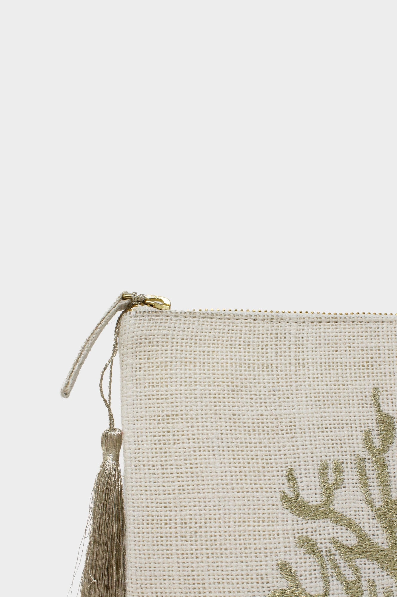 A perfect embroidered clutch bag that is compact and lightweight, composed of natural coloured woven fabric and finished with cotton embroidered coral motif.