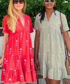 Meet the India dress, made from soft organic cotton gauze in our favourite Meredith shape, which features a deep V notch neckline, short sleeves, and a curved empire waistline. This dress has an all-over embroidery motif and contrast blanket stitch embroidery at the neckline, cuffs, and hem.