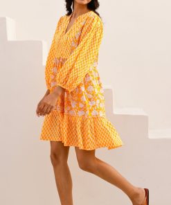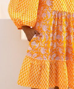 Introducing our Marina Dress, made from 100% organic cotton in a chic mini length. This dress is designed with functional pockets, romantic billowing sleeves with elasticated cuffs, and a flattering V-neckline. The contrasting prints add a bold, distinctive flair, elevating the dress’s timeless elegance. It also offers an optional front tie at the neckline for added versatility and charm.