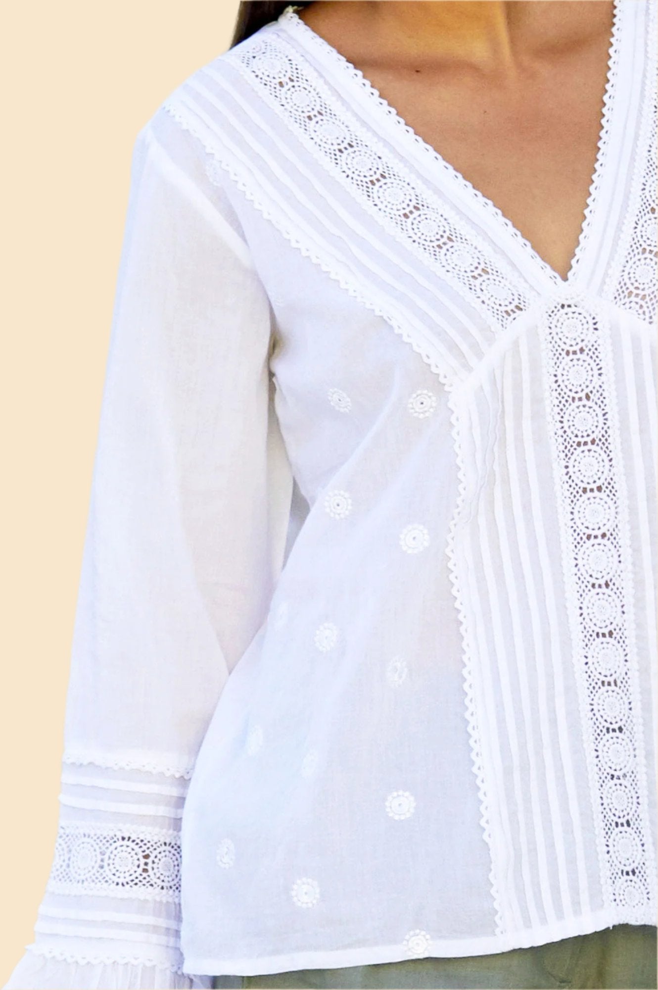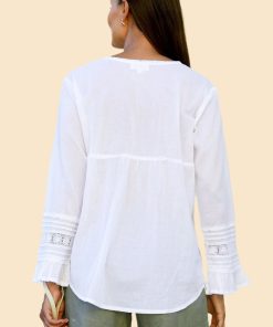 A fresh alternative to your classic button-through blouse, this pop over feminine style is made from soft organic cotton. Featuring a V-neckline, full-length sleeves and fluted gathered cuffs. Finished with lace detailing, circular embroidered motifs and cut to a curved slightly longer hem at the back.